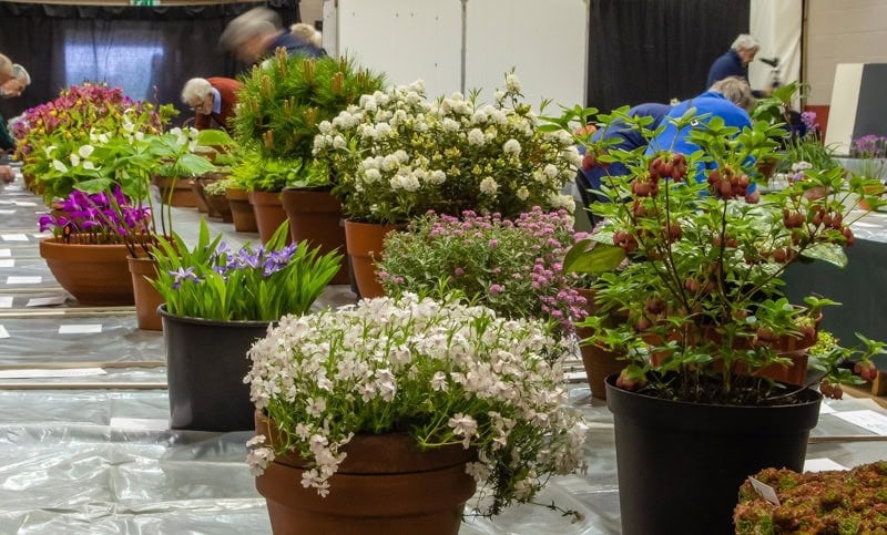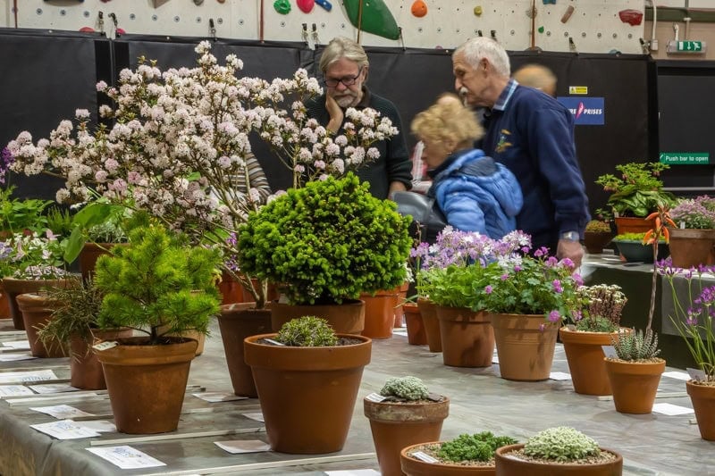 The hall was full of old friends from the Norfolk and other local groups. It was great to see the benches laid out with class markers and entry cards. Exhibitors were rushing in and out, filling the benches with pots, including some huge ones. Michael Sullivan stopped me and issued a health warning about carrying his large pots of Lewisia cotyledon hybrids. I didn’t attempt it. (last photo by Doug Joyce).